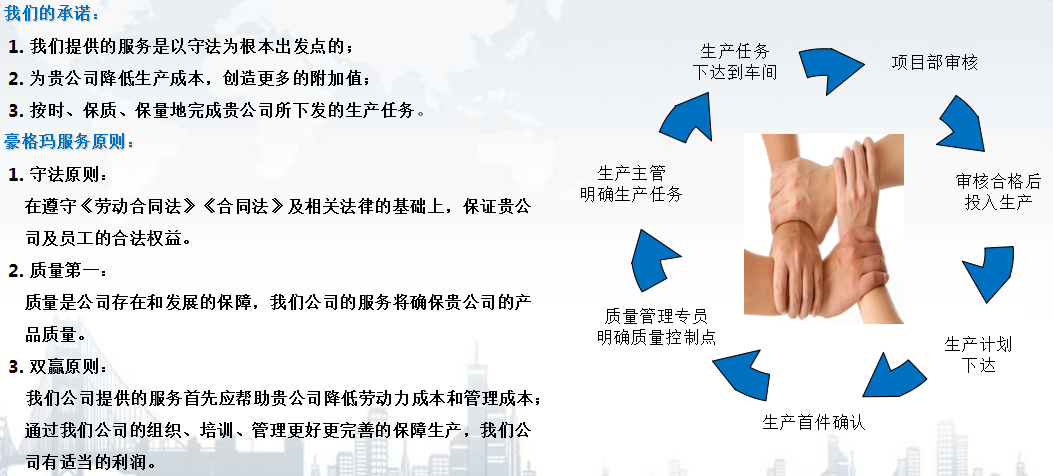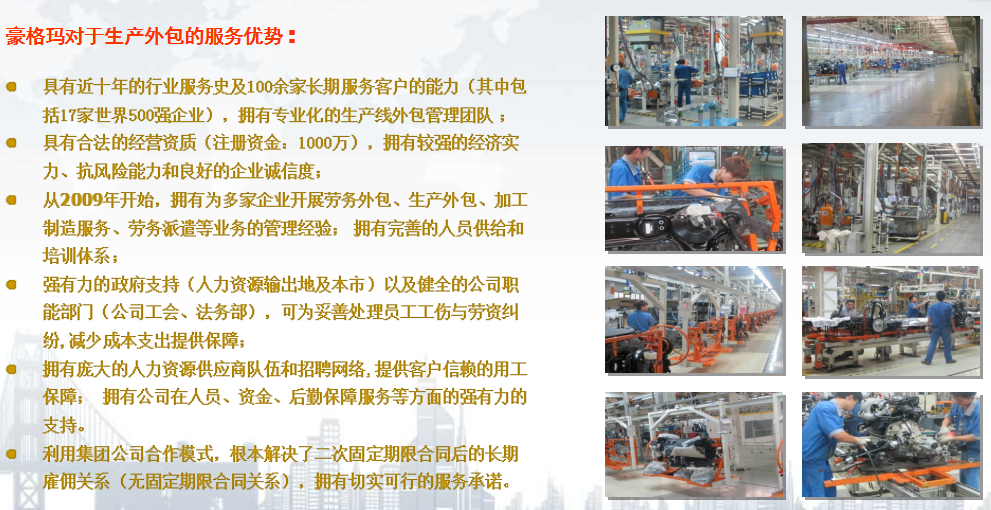 豪格玛具有一套完整的员工培训体系,以提升员工技能,多元化领域合作、覆盖广泛的业务范围,强劲的科研实力,在人力资源方面为企业提供员工招聘、劳务派遣、配工、劳务外包、生产外包、制造加工等服务,期待与各企业的真诚合作!