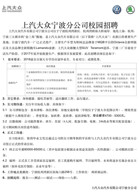 代招企业:上汽大众汽车有限公司宁波分公司