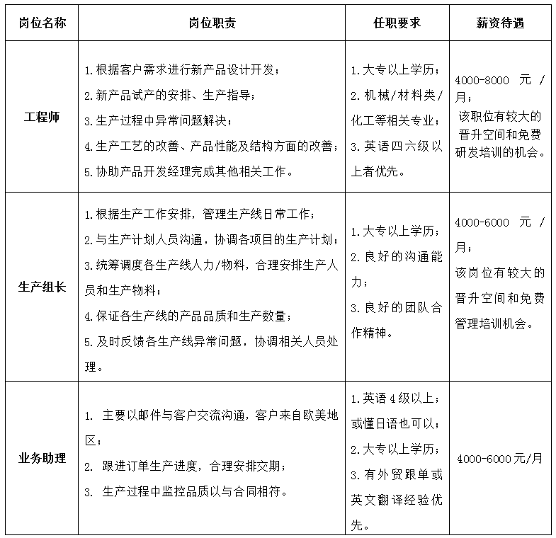 | 业务助理 | 专业不限,英语4级以上 | 2 | 不限 | 5月-10月 |