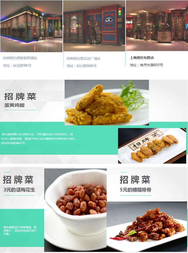 2015年新白鹿稳步布局杭州城北商圈,继续拓展上海市场和杭州周边市场,捷报频传。上海南京东路店荣获“大众点评上海新十大人气餐厅”第一名,而后,上海张扬路店、百联中环店,相继开业;湖州爱山银泰店成为湖州新晋人气餐厅。