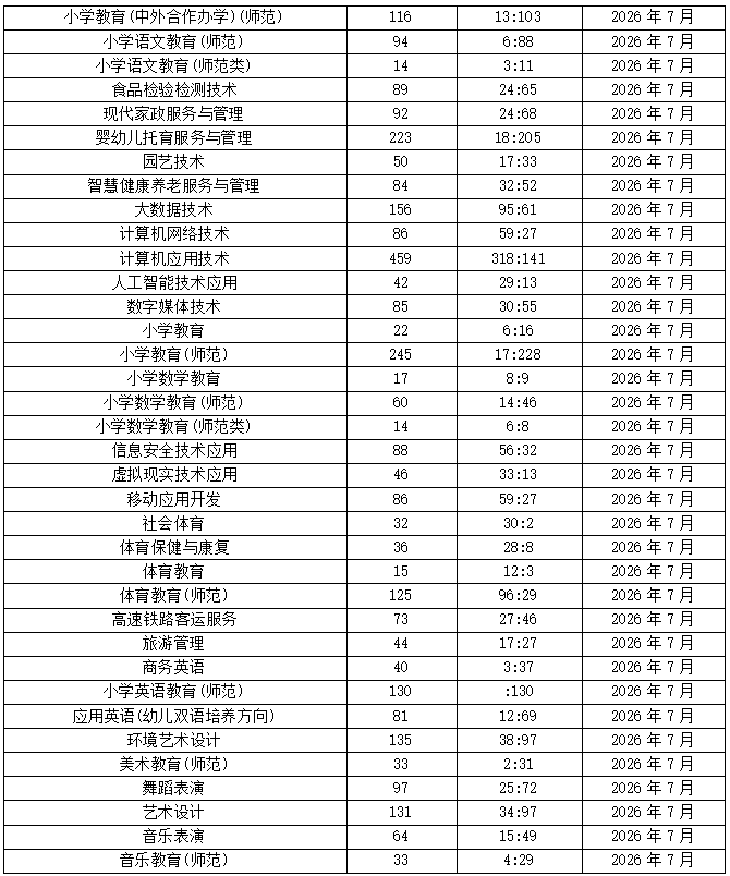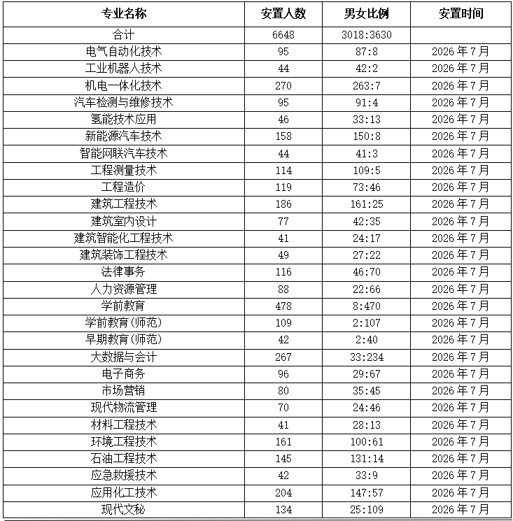 专业名称 安置或实习人数 男女比例 安置或实习时间