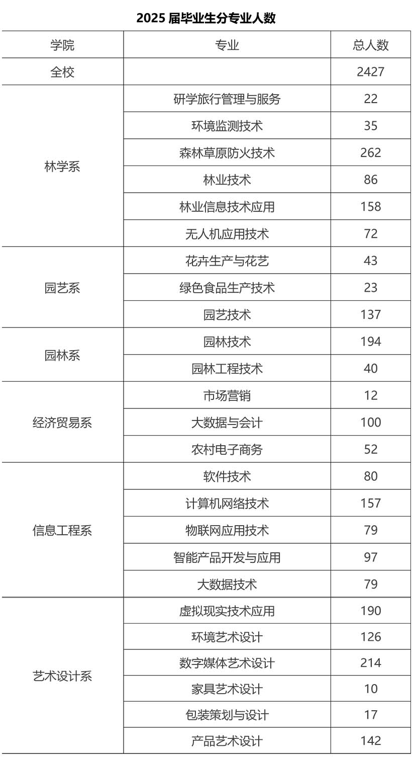 学院现设有林业技术、无人机应用技术、园艺技术、园林技术等特色专业40个,与181家行业企业建立校企合作关系。建有产业学院5个,校内实训基地81个、校外实训基地84个。近三年累计形成标志性成果国家级41项、省部级303项。其中,国家级重点专业和示范性实训基地3个,省级重点、特色、骨干、高水平专业和实训基地8个。创建名师(大师)工作室8个、省级教学创新团队5个、紧缺领域教师技术技能传承平台3个。基于服务乡村振兴,搭建协同创新平台2个,组建科研创新团队7个和技术服务团队2个,开展培训等技术服务80项,培训38000多人日。近5年毕业生平均就业率为90%以上,累计为社会培养了42000余名高素质技术技能人才。
