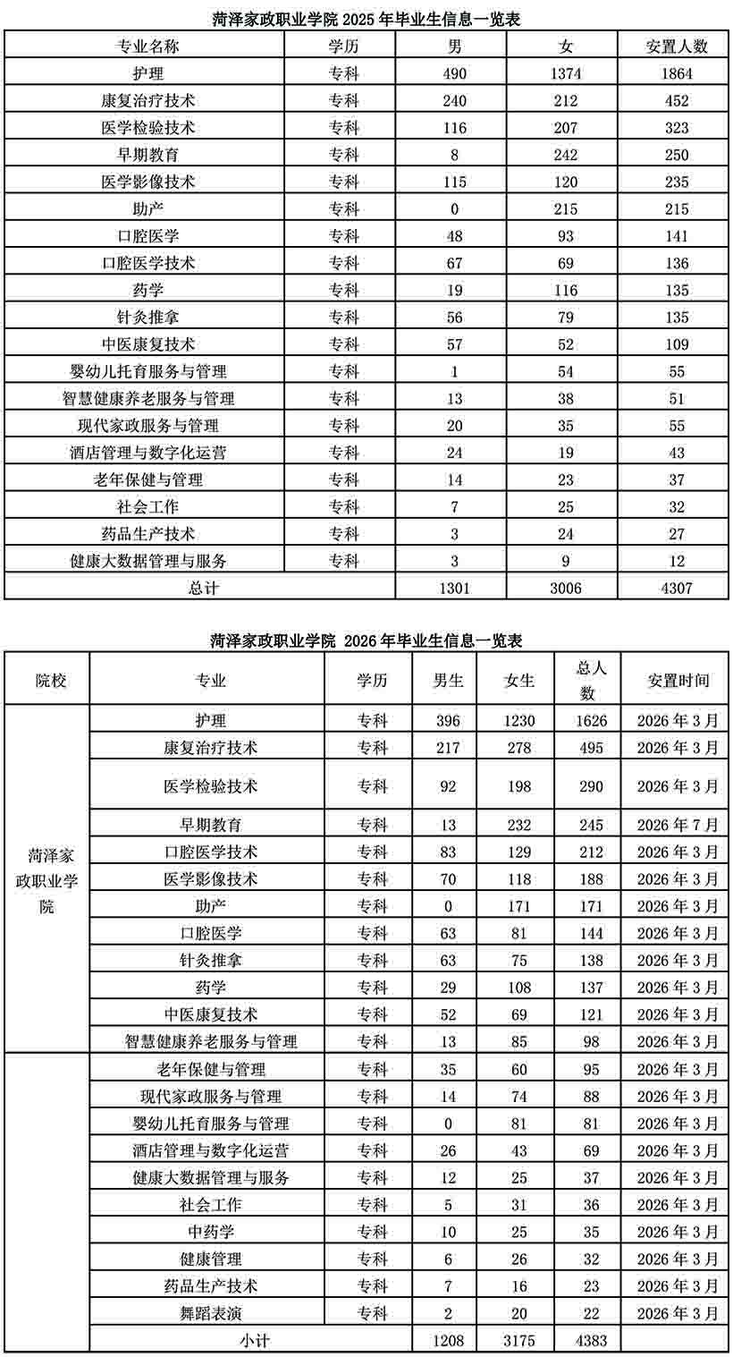 | 专业名称 | 安置或实习人数 | 男女比例 | 安置或实习时间 |
