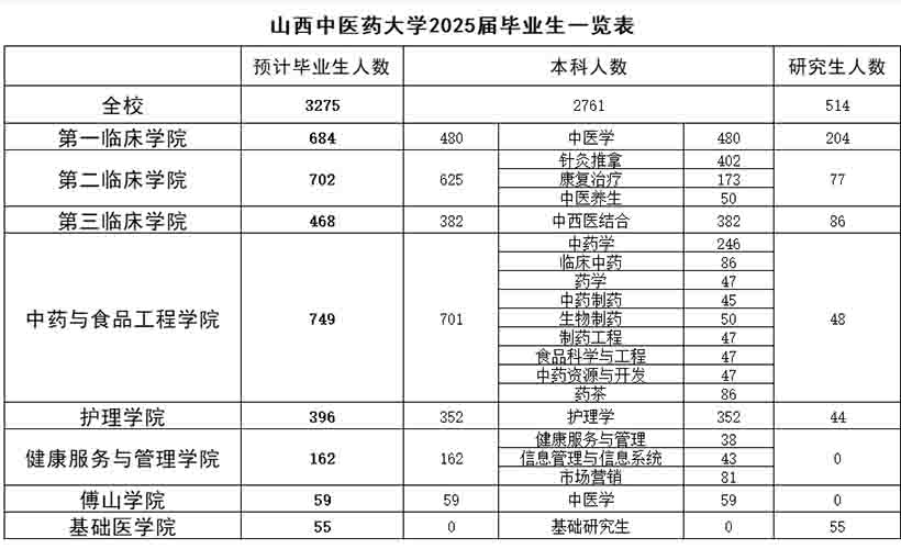 学校以中医药学科为主体,坚持中西医结合,多学科交叉协调发展,拥有中药学一级学科博士学位授权点,中医专业类别博士学位授权点,中医学、中药学一级学科硕士学位授权点,中医、中药、护理专业类别硕士学位授权点。现有国家中医药管理局高水平中医药重点学科4个,国家中医药管理局重点学科18个,山西省重点建设学科4个,山西省特色重点学科1个,山西省“1331工程”优势特色学科1个,山西省“高等学校服务产业创新学科群”1个。