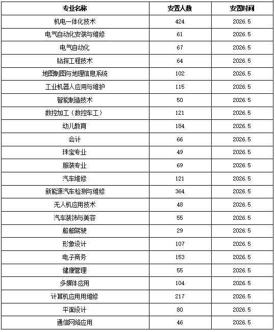 | 专业名称 | 安置或实习人数 | 男女比例 | 安置或实习时间 |