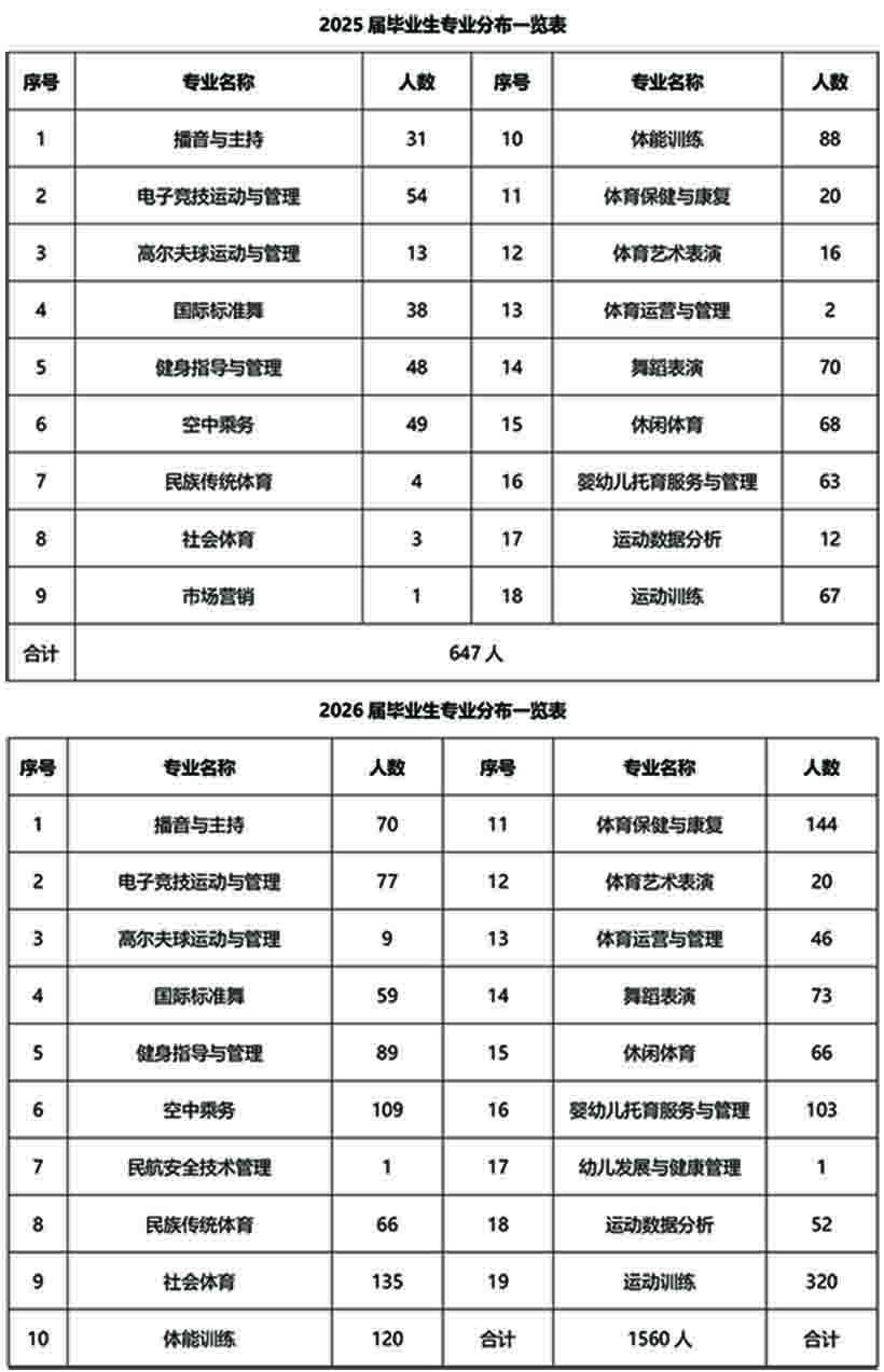 在专业设置上,学院与山西大学合作办学开展运动训练专业全日制本科学历教育;专科层次现开设运动训练、社会体育、休闲体育、高尔夫球运动与管理、民族传统体育、体育艺术表演、体育运营与管理、体育保健与康复、市场营销、电子竞技运动与管理、健身指导与管理、国际标准舞、舞蹈表演、婴幼儿托育服务与管理、空中乘务、民航空中安全保卫、民航安全技术管理、航空物流管理、播音与主持(体育解说方向)、运动数据分析、体能训练、无人机应用技术其中还设有五年一贯制:运动训练、体育保健与康复两个专业等二十二个专业。中专层次现开设运动训练(三年制和五年制)、体育保健与康复(三年制)两个专业。此外,学院还承担北京体育大学山西函授站教学任务。