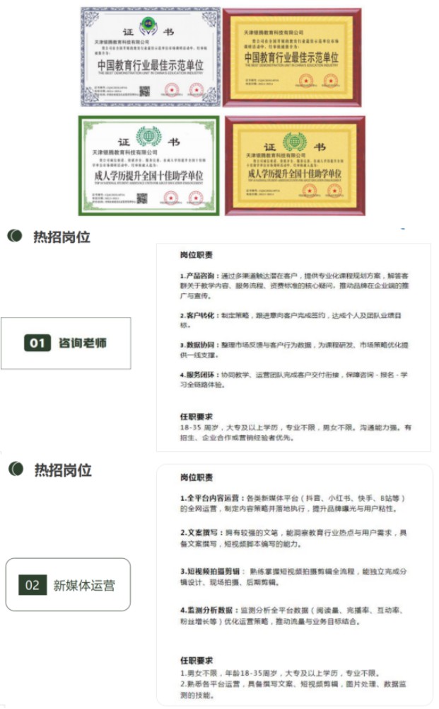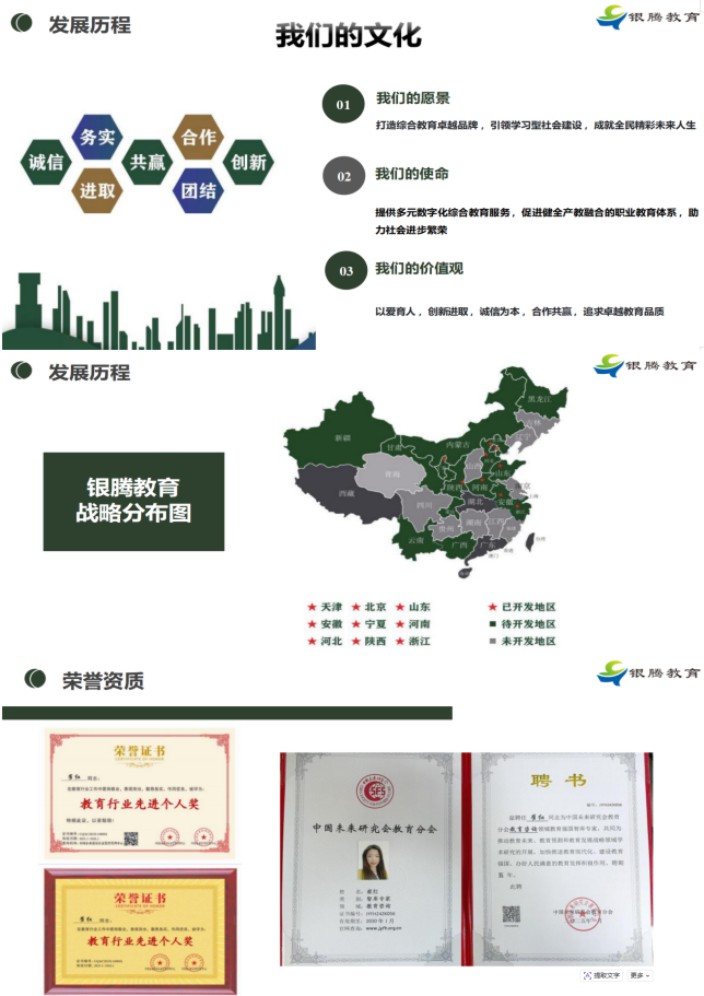 银腾教育在教育领域深耕十几载,业务遍布全国十几个城市,一直秉承以人为本,育人为先的理念,坚持做良心教育,以先进的科技理念,完善的教育服务系统,不断创新,以实力践行着教育公平的宗旨。公司业务涉及成人教育,职业教育,学业规划,大学生就业指导等项目得到了各界领导的支持、帮助与厚爱,并奠定了深厚的合作基础,并为在校大学生及高中毕业生以及在职人员提供全面的教育咨询、培训辅导等多元化的服务。