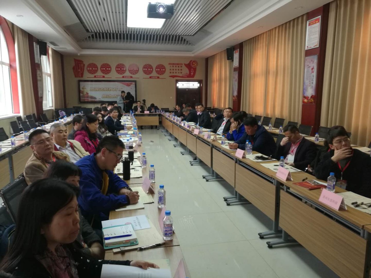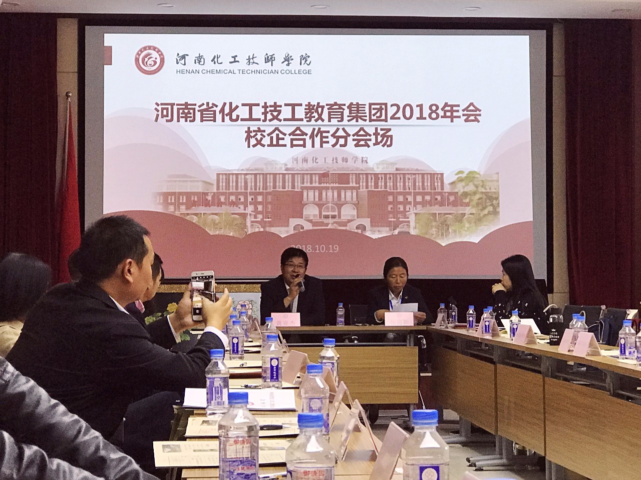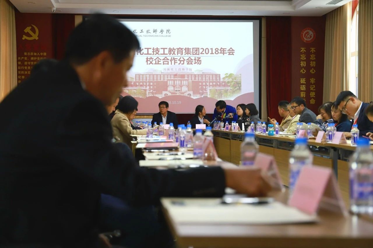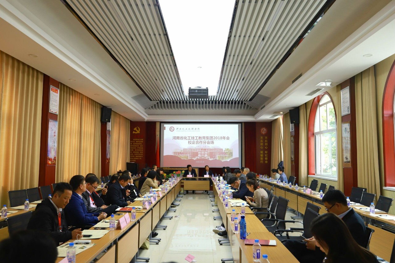 2018年10月19日下午 14:30河南省化工技工教育集团2018年会校企合作座谈会在河南化工技师学院顺利召开。会议主题是:春华秋实四十年,德技化院再出发;深化产教融合,加强校企合作。会议河南化工技师学院校企合作办公室张迎新主任主持。招生就业主管院长黄亚杰、招生就业处处长杨宏伟、培训处处长苏俊岭等学院领导及50多家企业领导参加了此次座谈会。