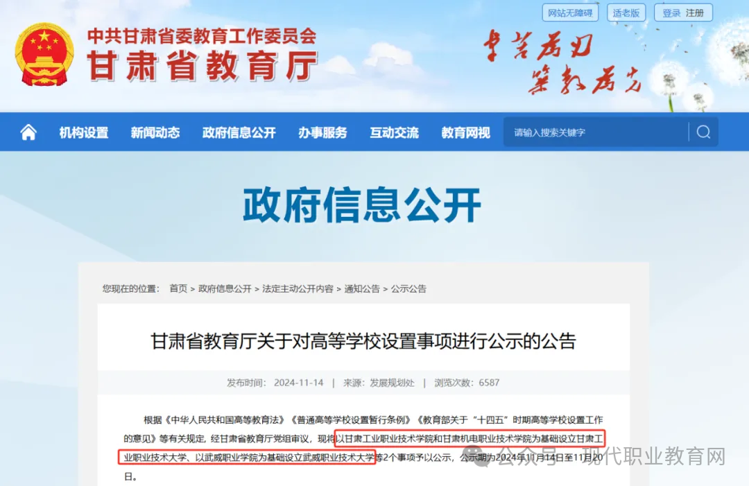 2024年11月14日,甘肃省教育厅发布关于对高等学校设置事项进行公示的公告,以甘肃工业职业技术学院和甘肃机电职业技术学院为基础设立甘肃工业职业技术大学。