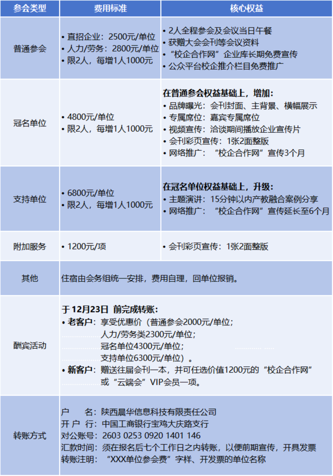 尊敬的企业HR及校企合作负责人: “致天下之治者在人才”。人才是企业发展的第一资源与核心竞争力,而深化产教融合、加强校企合作,正是企业汇聚英才、赋能未来的战略基石,对推动企业可持续发展和产业转型升级具有深远意义。 为搭建高效、精准的人才供需对接平台,助力企业广纳贤才、优化人才储备与培养体系,同时促进产业需求与教育供给有机衔接,推动校企合作项目务实落地、行稳致远。 我们谨定于:2026年1月13日(周二)在江西南昌,举办“第121届产教融合校企合作暨访企拓岗人才供需洽谈会”。届时全国众省市近百位院校负责人与企业界精英汇聚南昌,共享资源,共话合作,共谋发展。 谨此,我们诚邀您拨冗莅临,共襄盛会。具体事宜如下: 一、主办单位 陕西晨华信息科技有限责任公司 校企合作网【www.zgxqhzw.cn】 云端会【www.yunduanhui.cn】 二、会议主题 畅通合作渠道 赋能校企发展 三、会议特色 1、精准对接,资源优质:参会院校以华东地区为中心,辐射全国,涵盖本科(30%)、高职(55%)、技工技师及中专(15%)等多层次院校,均有明确的校企合作意向。与会者均为企业人力资源、研发、总经办及院校就业、校企合作、科研部门的负责人,确保洽谈高效、决策有力。 2、立体服务,长效赋能:大会提供“线下洽谈+线上平台”的立体化服务。现场除面对面交流外,还将编制详尽的《大会会刊》作为永久资料;线上通过“校企合作网”及“云端会”招聘平台,同步开展网络招聘会,直接打通企业与毕业生的对接通道。 3、严格审核,效果保障:为保障洽谈质量,我们将严格审核院校资质,并郑重承诺校企参会比例原则上维持1:1。若未达此比例,主办方将提供差额院校数量2倍的“校企合作网”点数为补偿,切实保障企业参会收益。 四、会议议程 2026年1月12日:报到 2026年1月13日:会议 (一)开幕式(8:30-10:00) 1、主办方致辞; 2、校企合作、产教融合典型案例推介、分享;产教融合共同体高质量发展成功经验分享; (二)洽谈交流、现场签约(10:00-11:30) 1、人才共育: • 人才招聘与毕业生实习、见习 • 1+X证书制度推进与学历提升合作 • 出国留学与国际职业教育合作 2、资源共建: • 合作共建实训、实习及产教融合基地 • 生活设施、教学设备、图书教材等解决方案合作 • 合作成立专业教学指导委员会 3、发展共谋: • 产学研协同创新与技术合作 • 课程开发、专业共建及二级产业学院设立 • 共建产教融合共同体 (三)合影留念(11:30-12:00) (四)午餐(12:00-13:30) 下午:校企自行联谊活动 2026年1月14日:返程 五、会议费用