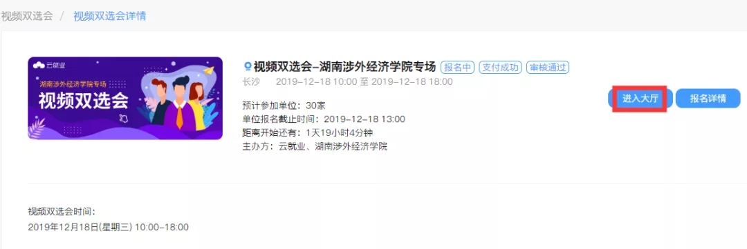 单位报名被审核通过后,登录单位后台进入视频双选会--XX专场,点击“进入大厅”