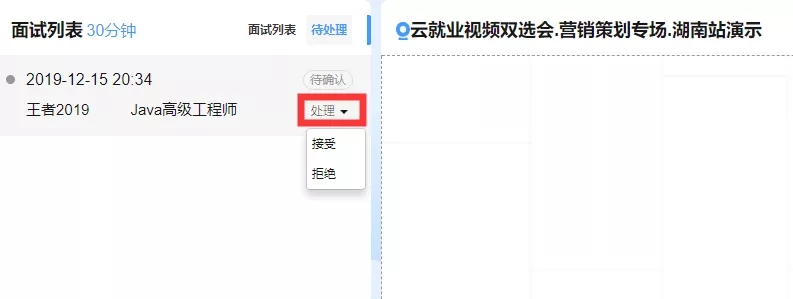 进入面试大厅首页,若面试列表中,“待处理”界面显示有尚未处理的求职者,可查看右侧求职者简历,查看完毕后可点击处理中的“接受”或“拒绝”,接受则纳入本场面试人员中,否则不纳入(拒绝后不可再进来)。