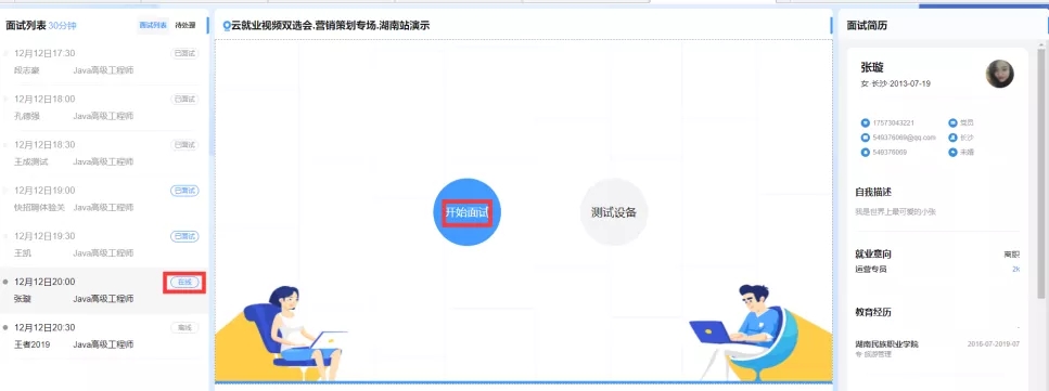 待视频双选会开始时间一到,单位即可对“面试列表”中的在线求职者进行发起面试,点击“开始面试”即可与求职者建立视频连接,开始正式的视频面试