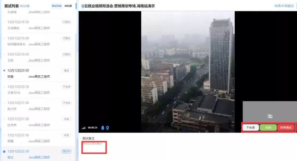在面试中,针对改求职者情况可在下方面试备注处边面试,边具体备注面试情况。在面试结束后,针对求职者要标注“合适”或者“不合适”,在标注后选择结束面试即可。同样,再对发起面试列表中的其他在线求职者进行面试