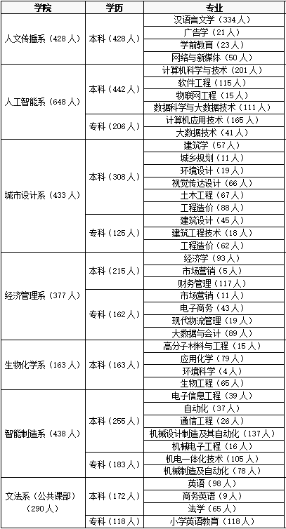学校依托湖北工程学院优质办学资源,根据市场和社会需求,按大学科门类整合的思路现设置有人文传播系、经济管理系、城市设计系、人工智能系、智能制造系(生物化学系)和文法系(公共课部)等6个教学系,开办有31个本科专业和11个专科专业,其中大部分专业依托湖北工程学院的优势和特色专业开办,具有广阔的就业前景,生物工程专业现被列为湖北省教育厅重点(培育)本科专业建设项目,光电信息科学与工程和电子信息工程专业获批湖北省高等学校战略性新兴(支柱)产业人才培养计划项目,计算机科学与技术专业获批省级一流专业建设点,依托该专业获批第二批“湖北省服务外包人才培养(训)基地”,《市场营销学》等8门课程被认定为省级一流本科课程,电子信息教研室被认定为省级优秀基层教学组织。学校水彩(粉)画创作项目获批国家艺术基金资助项目。目前,共有在校学生近10000人,专任教师300余人,外聘教师200余人。