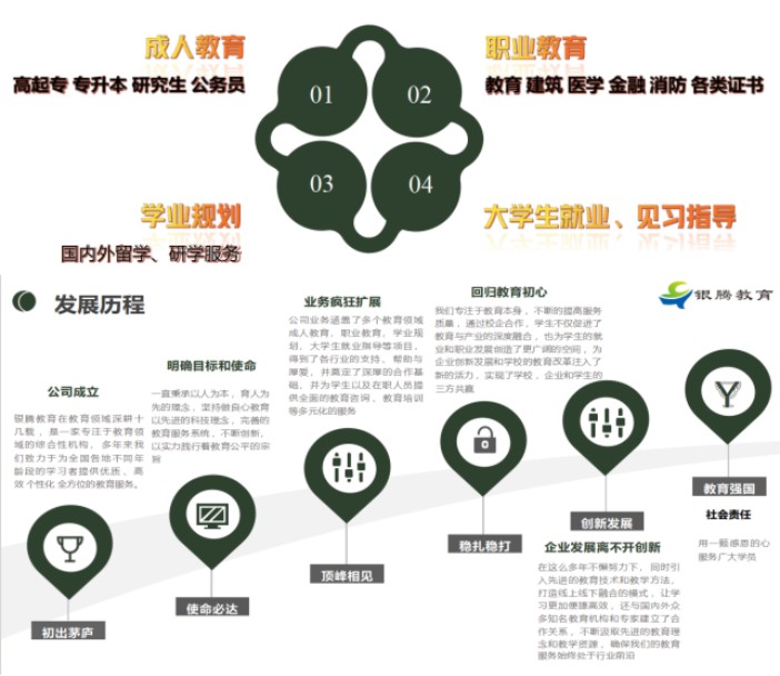银腾教育在教育领域深耕十几载,业务遍布全国十几个城市,一直秉承以人为本,育人为先的理念,坚持做良心教育,以先进的科技理念,完善的教育服务系统,不断创新,以实力践行着教育公平的宗旨。公司业务涉及成人教育,职业教育,学业规划,大学生就业指导等项目得到了各界领导的支持、帮助与厚爱,并奠定了深厚的合作基础,并为在校大学生及高中毕业生以及在职人员提供全面的教育咨询、培训辅导等多元化的服务。