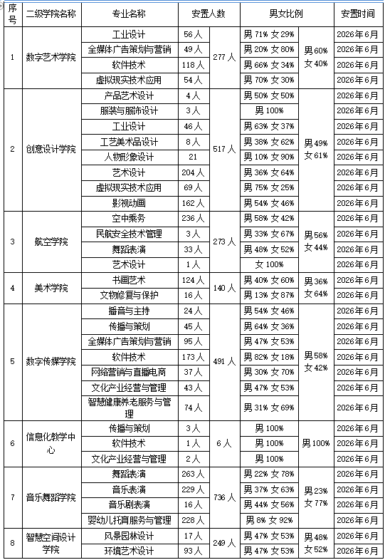 | 专业名称 | 安置或实习人数 | 男女比例 | 安置或实习时间 |