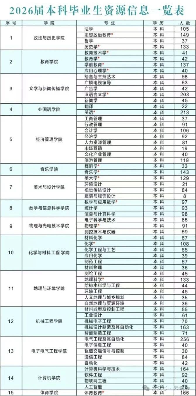 学校2026届毕业学生5365人,其中本科5007人,硕士358人。本科毕业生中师范类毕业生1859名(其中优师计划毕业生117人),占37.13%,非师范类毕业生3148名,占62.87%;硕士毕业生中师范类毕业生14名,占3.91%,非师范类毕业生344名,占96.09%;男生2315名,占43.15%,女生3050名,占56.85%。2026届本科毕业生分布在全校15个学院的62个本科专业,来自全国31个省、市、自治区。